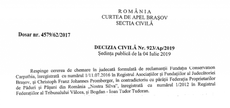 Conservation Carpathia şi Christoph Promberger au dorit instituirea unei cenzuri perpetue cu privire la activitățile lor Curtea de Apel Braşov, prin decizia civilă 923 din 4 iulie 2019 pronunțată în dosarul 4579/62/2017, a respins cererea de chemare în judecată formulată de Fundația Conservation Carpathia şi Christoph Franz Johannes Promberger împotriva Nostra Silva – … Continuă lectura Nostra Silva cȃştigă procesul cu Fundația Conservation Carpathia şi Christoph Promberger