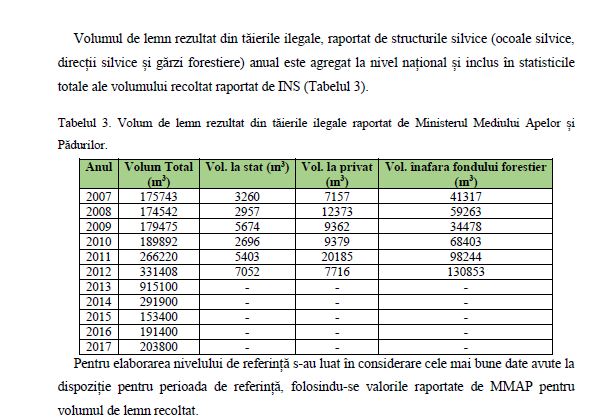 Mai mult decât atât, în luna decembrie 2019, Ministerul Mediului, Apelor și Pădurilor a transmis către Comisia Europeană un “Raport de contabilizare pentru domeniul pădurilor al gazelor cu efect de sera PENTRU PRIMA PERIOADĂ DE ANGAJAMENT (2021-2025)“, elaborat de INCDS-Marin Drăcea, asumat și transmis de către Minister în numele Romaniei, către Comisia Europeană, după schimbarea conducerii INCDS Marin Dracea, deci în total control și responsabilitate. În raport Ministerul Mediului nu folosește pentru tăierile ilegale cifrele “asumate” de către domnul ministru ca rezultat al IFN, ci datele Institutului Național de Statistică, de 150-200 000 mc/an! Se arată în raport: “Dacă problemele metodologice ce privesc valoarea lemnului dispărut între cele două cicluri IFN sunt soluționate sau dacă va exista o sursă de date mai bună pentru volumul de lemn tăiat ilegal, România va avea în vedere aplicarea unor corecții tehnice a valorii nivelului de referință.” Deci în rapoarte oficiale Ministerul Mediului recunoaște problemele metodologice cu privire la rezultatele IFN, pentru circul mediatic promovat, dl Ministru Costel Alexe “asumă” cifra de “38,6 milioane mc tăieri, dintre care doar 18 milioane mc tăieri legale”.