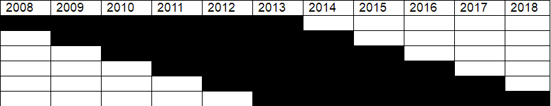 Total (100 %) = 1/30 Media 2008 + 2/30 Media 2009 + 3/30 Media 2010 + 4/30 Media 2011 + 5/30 media 2012 + 6/30 media 2013 + 5/30 Media 2014 + 4/30 Media 2015 + 3/30 Media 2016 + 2/30 Media 2017 + 1/30 Media 2018.